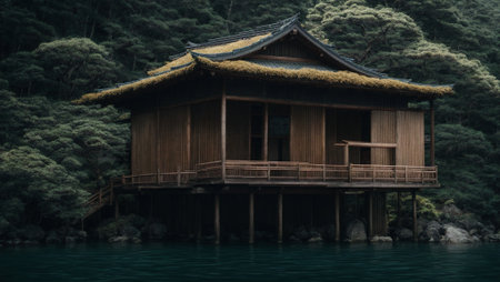 Japanese style bamboo house in the middle of the sea surrounded by mountains. Abstract, calm, misty, mysterious, relaxing, winter, Japanese, luxurious, modern design. local style design ideas