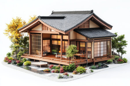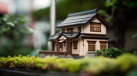 A small model of a Japanese house with a tree in front of it. The house is surrounded by rocks and has a peaceful, serene atmosphere