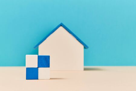 Model of house miniature on blurred background. Square of wooden cubes in white, blue colours. Mockup style. Copy space