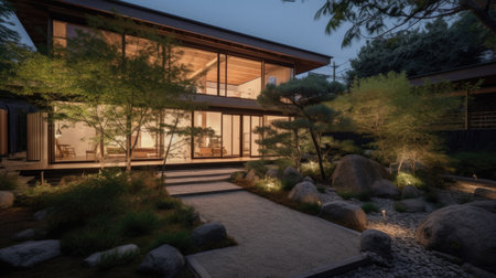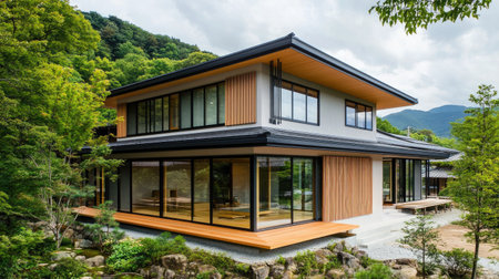 An exterior view of a modern Japanese home with a minimalist design, clean lines, and large windows, blending seamlessly with the surrounding natural landscape.