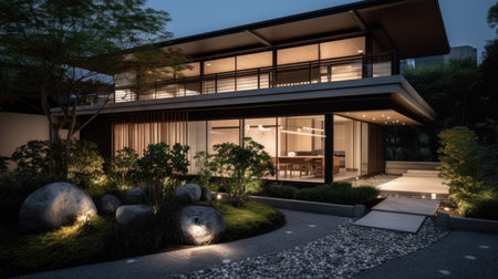 A dynamic image of a modern Japanese house blending traditional elements with contemporary design, showcasing a clean, minimalist exterior with large windows and a sleek roofline.