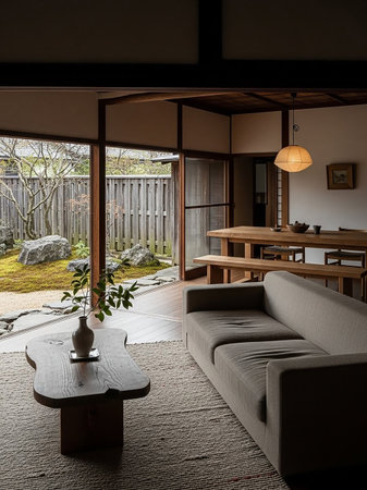 A tranquil Japanese-style living room with a neutral sofa, wooden coffee table, and a view of a serene rock garden through large windows.
