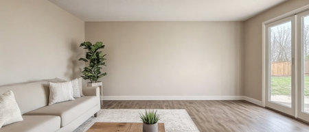 A spacious living room features a light-colored sofa and a cozy rug, enhanced by natural light streaming through large glass doors. A potted plant adds a touch of greenery to the space.
