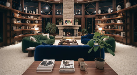 A cozy living room with modern furniture, featuring green and blue sofas, a stone fireplace, bookshelves, and decorative plants