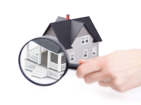 Real estate concept - hand holding magnifying glass in front of the home architectural model, isolated