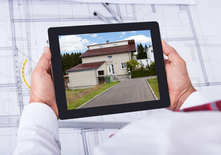Close-up Of Male Architect Holding Digital Tablet Over Blueprint