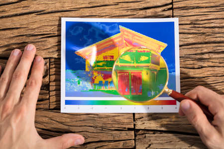 Person Analyzing The Heat Loss And Energy Efficiency Of A House With Magnifying Glass