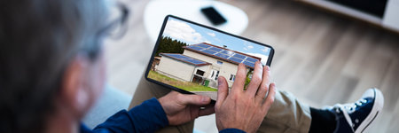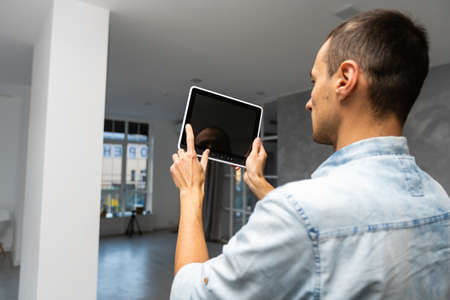 Hands of young man and woman holding touchscreen with advert of new luxurious apartment or house in new district