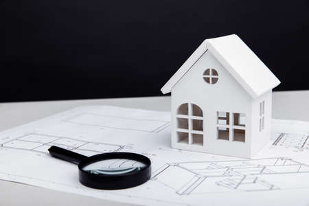 White model of house and a magnifying glass on a drawing. Real estate building concept