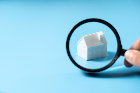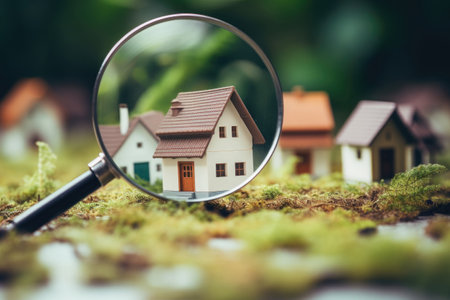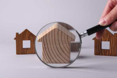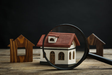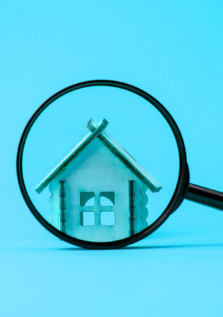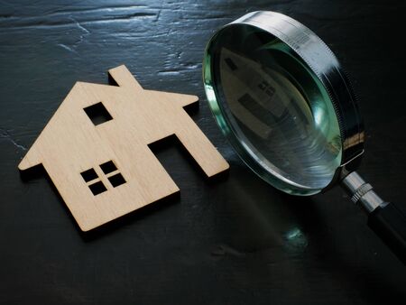 Miniature wooden house and magnifying glass. Home appraisal. Property valuation. Choice of location for the construction. House searching concept. Search for housing and apartments. Real estate