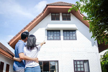 Asian couples are happy to have a new home. Moving house. Family concept. real estate business. copy space
