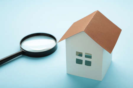 Magnifying glass and house. House searching concept. Home appraisal. Property valuation. Choice of location for the construction. Search for housing, apartments. Real estate appraiser