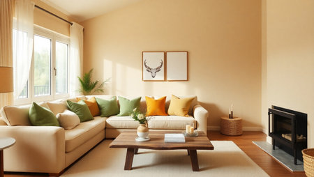 Modern living room interior in scandinavian style with sofa, coffee table and plants