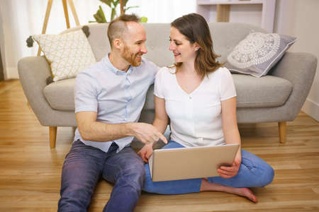 couple check the laptop on the living room