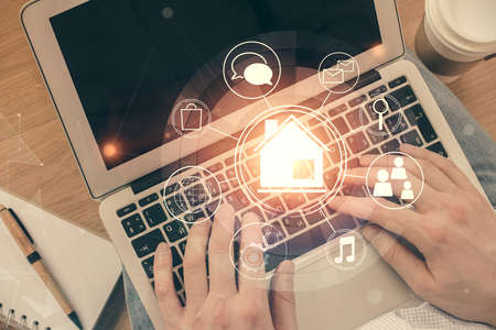 Real estate concept business, home insurance and real estate protection. Buy and sell houses and real estate online on a virtual screen.