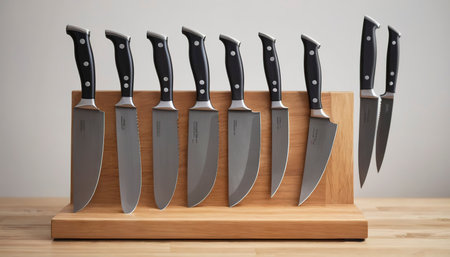 A neat row of various kitchen knives with blade edges reflecting light on a wooden rack