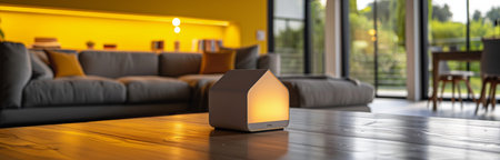 A white house-shaped lamp with a warm glow sits on a wooden coffee table in a living room. The couch is out of focus in the background.