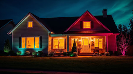 Suburban house glowing with colorful smart lights at night, creating a vibrant and welcoming atmosphere. Ai generated image