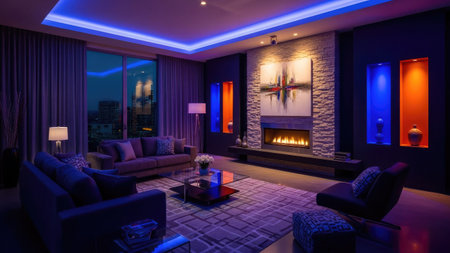 A modern living room interior features a contemporary fireplace with artwork, showcasing various textures and colors. The scene utilizes a diverse color palette, with ambient lighting creating a sophisticated atmosphere. The setting suggests an indoor environment, suitable for potential commercial uses related to interior design or lifestyle.