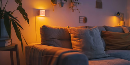 A couch with a yellow light on it and a plant on the left side