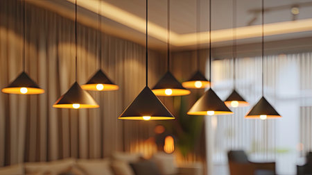 a group of sleek, modern pendant lights featuring geometric lampshades, suspended gracefully from regular electric cables, adding a touch of contemporary elegance
