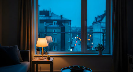 A view through an apartment window at twilight showing city buildings and streetlights outside. Inside a warm lamp glows on a side table creating a cozy and contemplative evening atmosphere contrasting with the cold blue hour outside.