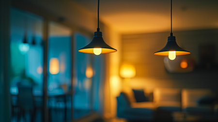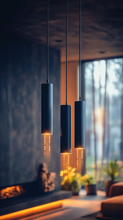Stylish pendant lamps provide warm ambient lighting in a cozy modern living room setting