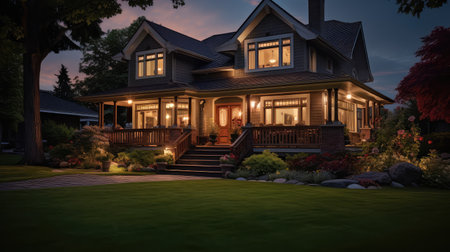 Soft light illuminates the windows of a charming house as evening approaches, creating a welcoming atmosphere in the tranquil setting.