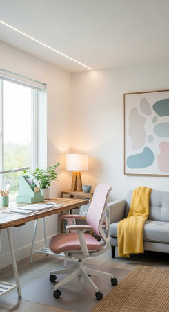 A bright and modern office interior featuring colorful artwork, a comfortable sofa, and a stylish desk, all enhanced by ample natural light and a calming atmosphere.