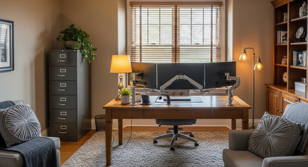 Contemporary home office with a minimalist desk, ergonomic chair, and modern decor. Task lighting ensures proper illumination over the desk, while ambient lighting