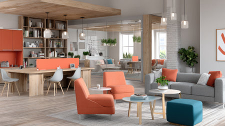 The image showcases a modern office space, featuring a colorful design with contemporary furniture and decor, perfect for advertising or editorial content.