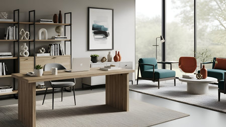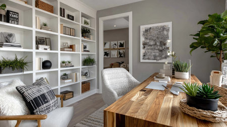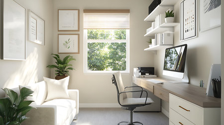 A serene and inviting home office space with natural light, modern desk, decorative shelves, and lush greenery promoting a productive and creative environment.