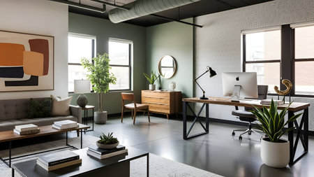 This open-plan office space boasts floor-to-ceiling windows, offering stunning views of the city skyline The industrial design is complemented by modern furniture, creating a vibrant and inspiring