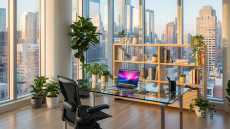 This image depicts a stylish and contemporary office space featuring a glass desk with a laptop, surrounded by numerous potted plants. The room is well-lit with natural light streaming through large windows that offer a breathtaking view of a city skyline. The office is decorated with a wooden bookshelf filled with books and various items, contributing to a professional yet cozy atmosphere.