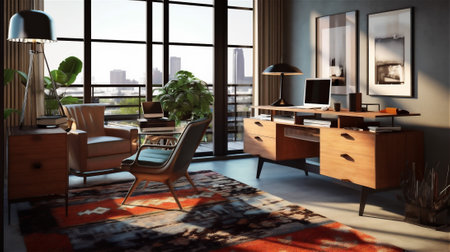 Interior design of Home Office in Mid-century style with Statement Desk decorated with Wood Flooring, Geometric Rug material. Mid-century architecture. Generative AI AIG24.