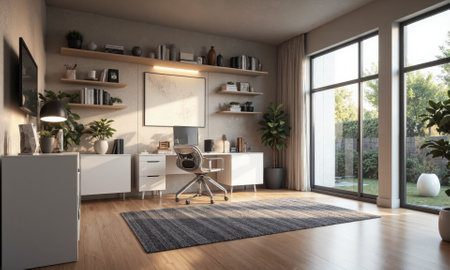 Modern home office with wall-mounted shelves, ergonomic chair, and minimalist dcor in soft, natural lighting