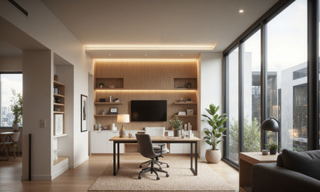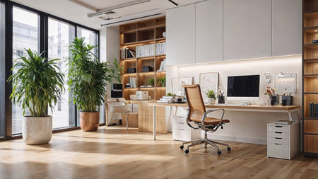 Bright Office with Natural Materials and Clean Design Office space with large windows providing natural light. A minimalist wood desk paired with ergonomic
