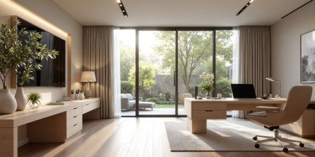 Elegant home office with wooden furniture and large windows overlooking a beautiful garden with trees and plants