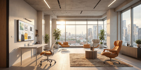 Bright and inviting modern workspace featuring stylish furniture and technology, perfect for fostering creativity and productivity in a serene environment.