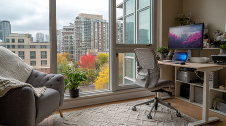 A cozy home office featuring modern furniture and a stunning cityscape view through large windows. The urban atmosphere is enhanced by autumn foliage, creating a serene environment for productivity and relaxation.