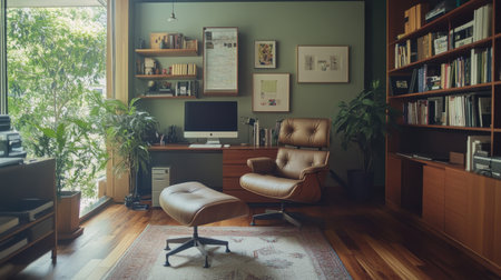Interior design of Home Office in Mid-century modern style with Desk decorated with Wood, Leather, Metal, Glass, Concrete material. Minimalist architecture. Generative AI AIG24.