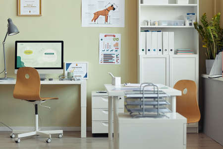 Background image of modern vet clinic interior, focus on workplace desk and certificates on wall, copy space