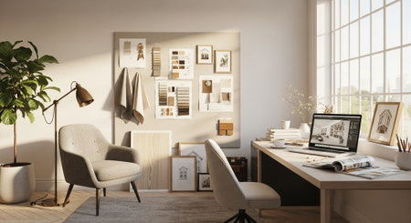 Bright and inviting workspace designed for productivity, showcasing artistic visuals alongside a sleek, modern desk setup.