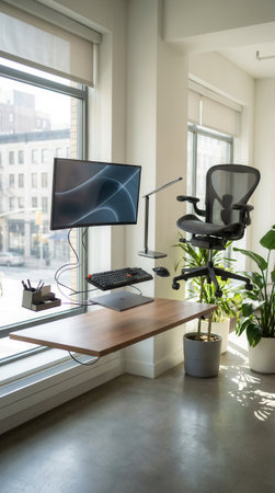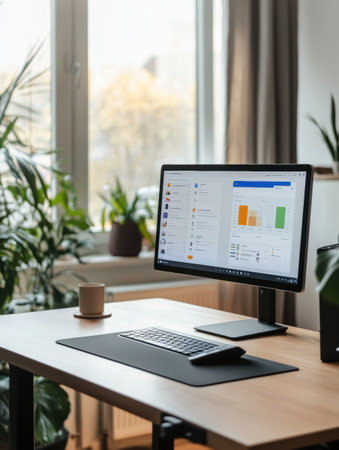 A well-organized office workspace features an adjustable height desk, plants, and a monitor showing data analytics in daylight.