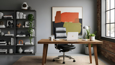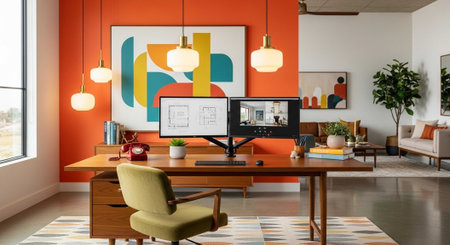 Modern home office with vibrant decor and natural elements