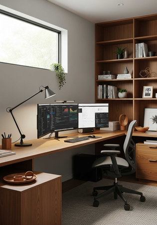 An organized home office with dual monitors, plants, and natural light fosters a productive atmosphere.