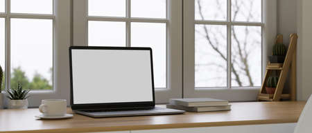 Scandinavian interior design, comfortable workspace near the window, laptop blank screen mockup on wooden desk, 3d rendering, 3d illustration