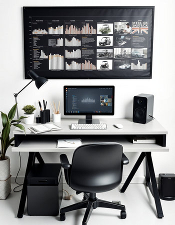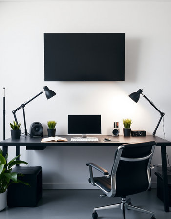 Modern home office with black computer and black desk. Workplace and lifestyle concept