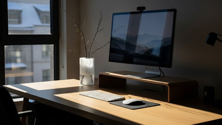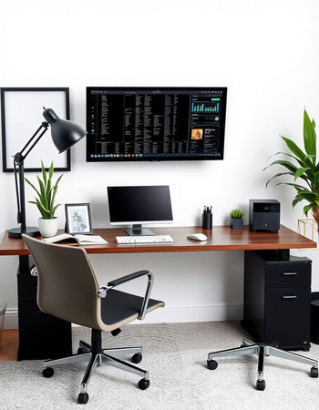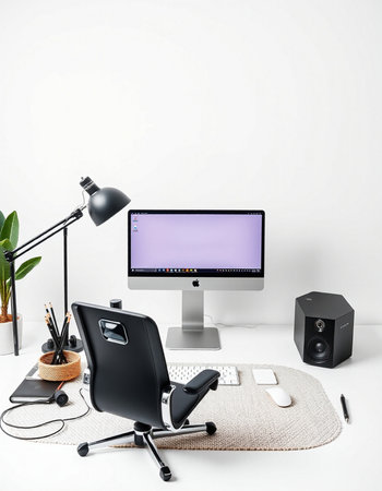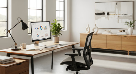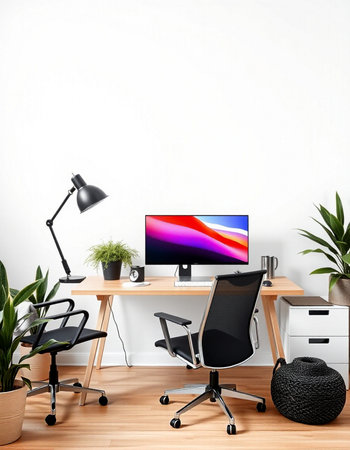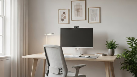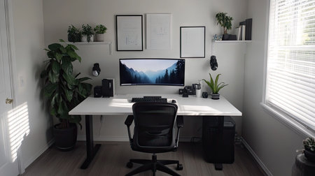 This image showcases a contemporary home office environment featuring a desk, computer, and chair. The scene is illuminated by soft, natural light, highlighting the minimalist design. Decorative framed art and a potted plant add visual interest. It is suitable for various commercial uses, including website design and editorial content.