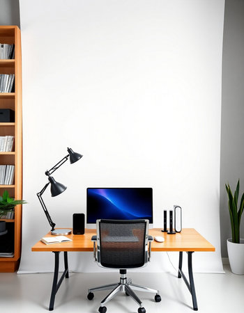 Modern workplace with computer on desk and lamp on white wall, stock photo